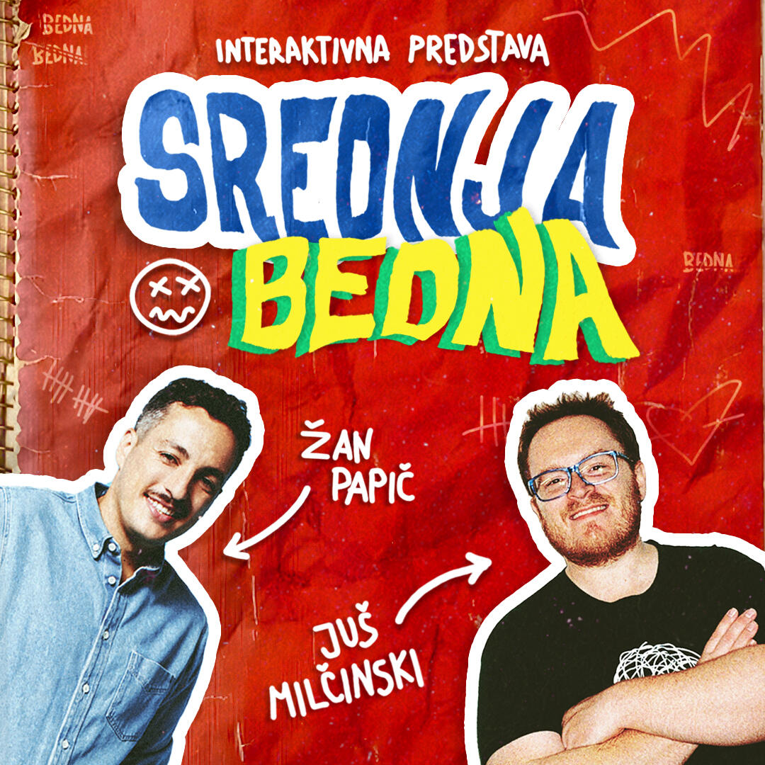 Kaj je skupnega srednji šoli in občutku bednosti? Vse. Tako vsaj pravi stand-up komik Žan Papič, ki je sam v srednji šoli večkrat sedel v klopi in si želel, da bi mu kdo povedal, da ni edini, ki se počuti… čudno. Zato je skupaj z igralcem Jušem Milčinskim ustvaril edinstveno predstavo, ki mladim ne soli pameti – ampak jih vključuje.Predstava Srednja Bedna ni "predavanje", temveč živ dialog s srednješolci. Skozi smeh, osebne zgodbe in igrane prizore mlade nauči: small talka, izražanja svojih občutkov, sprejemanja drugačnih mnenj, sprejemanja in dajanja pohval – in najtežje od vsega: sprejemanja sebe.Predstava ni samo ogled – je sodelovanje! Dijaki skozi interaktivne naloge in pogovor aktivno sodelujejo, delijo pohvale in v tem celo tekmujejo. Ja, prav ste slišali. Ker v šoli vsi tekmujejo v ocenah, športu in znanju – zakaj pa ne tudi v tem, kako biti dober človek, prijatelj, sošolec ali sošolka?Na koncu razglasimo zmagovalca z "Naj pohvalo", ki prejme prav poseben pokal.Avtorski projekt Žana Papiča in Juša Milčinskega.